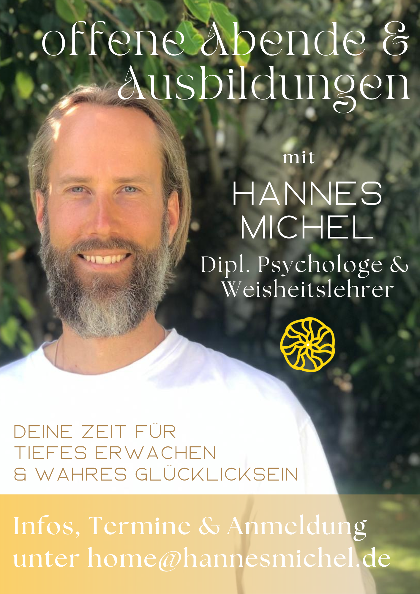 Durch geführte Meditationen, stille Präsenz und gezielte Führung durch Fragen und Antworten führt Hannes dich und die Gruppe in grenzenloses Gewahrsein, die Erfahrung allumfassender Liebe und zeigt einen Weg in wahres Glücklichsein auf.